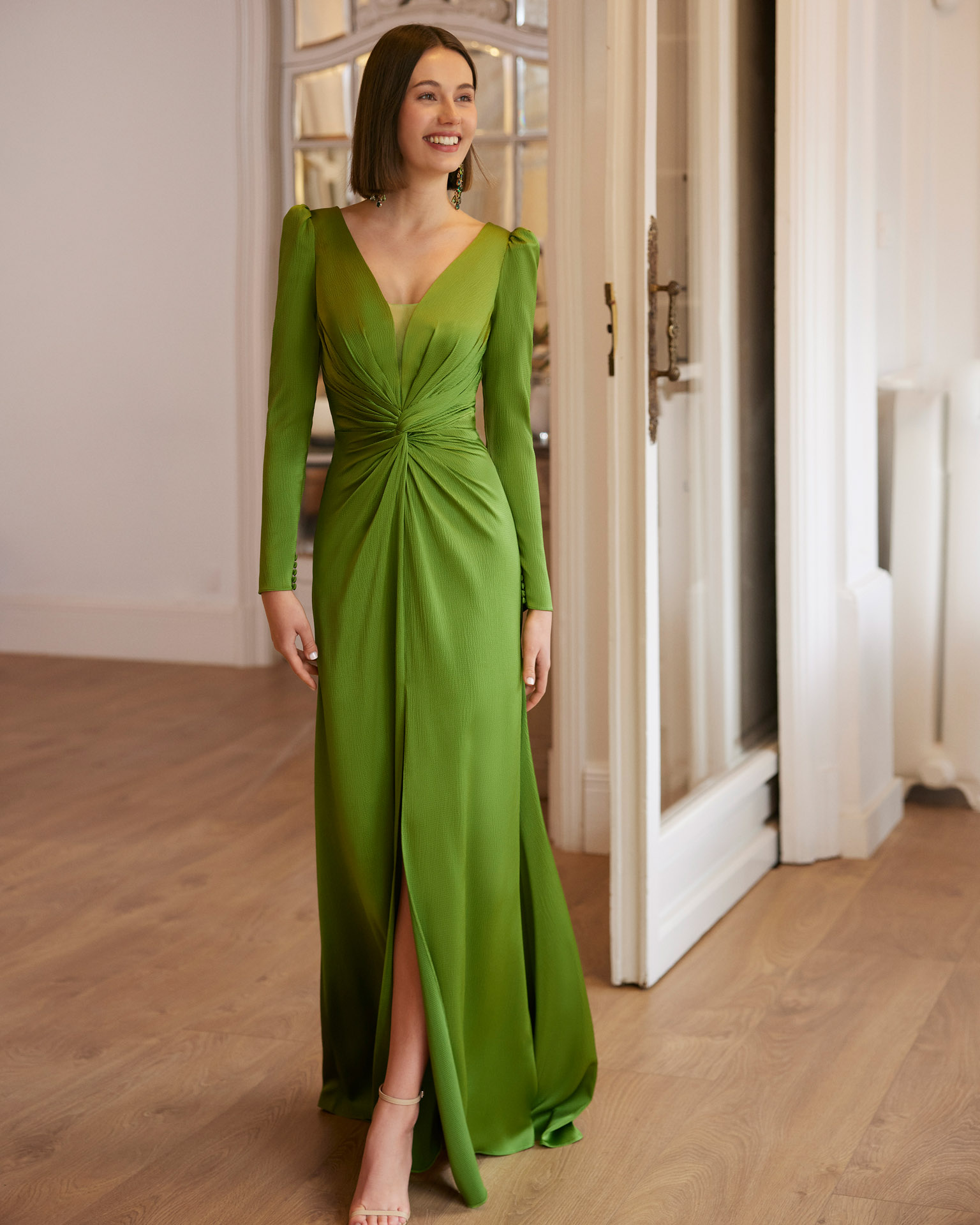 Vestido de fiesta confeccionado en Cloque. Tejido fluido con corte en la falda.