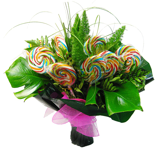 Un poco de verde y una explosión de color y azúcar con unas coloridas piruletas.